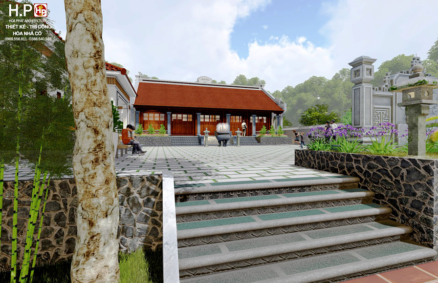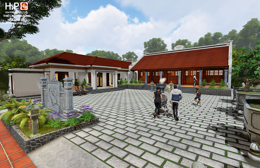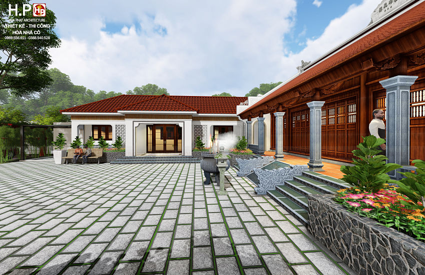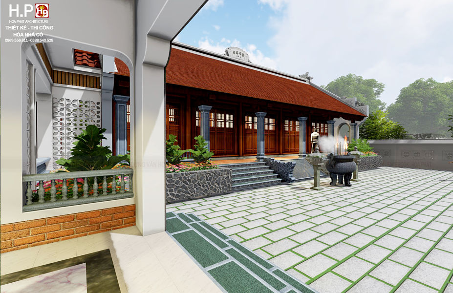 ♦ Nhà gỗ 5 gian được thiết kế với hướng đẹp và thuận lợi. Nhà được thiết kế 2 mái được lợp ngói ta nung thủ công. Trên phần đỉnh mái được gắn bia đại tự và đắp vẽ chữ nôm cổ, có sơn màu đậm, bờ nóc được đắp vẽ và trang trí dải hình hoa chanh, 2 bên đầu hồi đắp con chiện và con đấu, hai đầu nhà thì xây tường bít đốc, phía bên ngoài được xây gạch không trát. Trước sân được lát đá tự nhiên, gồm 1 cuốn thư nhỏ, 1 hồ sen giúp điều hòa bầu không khí trong lành.