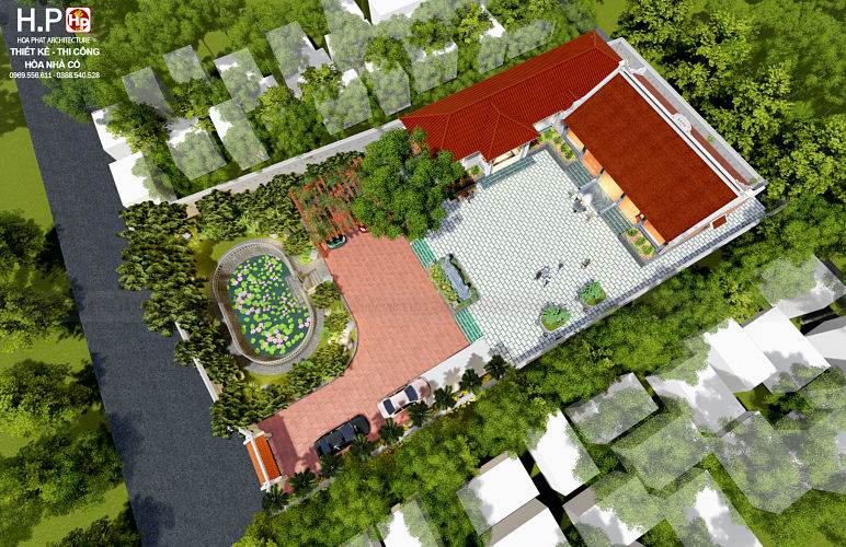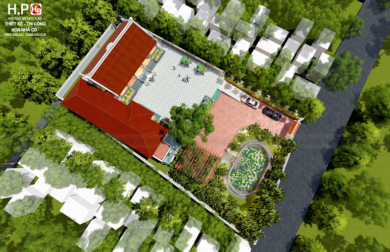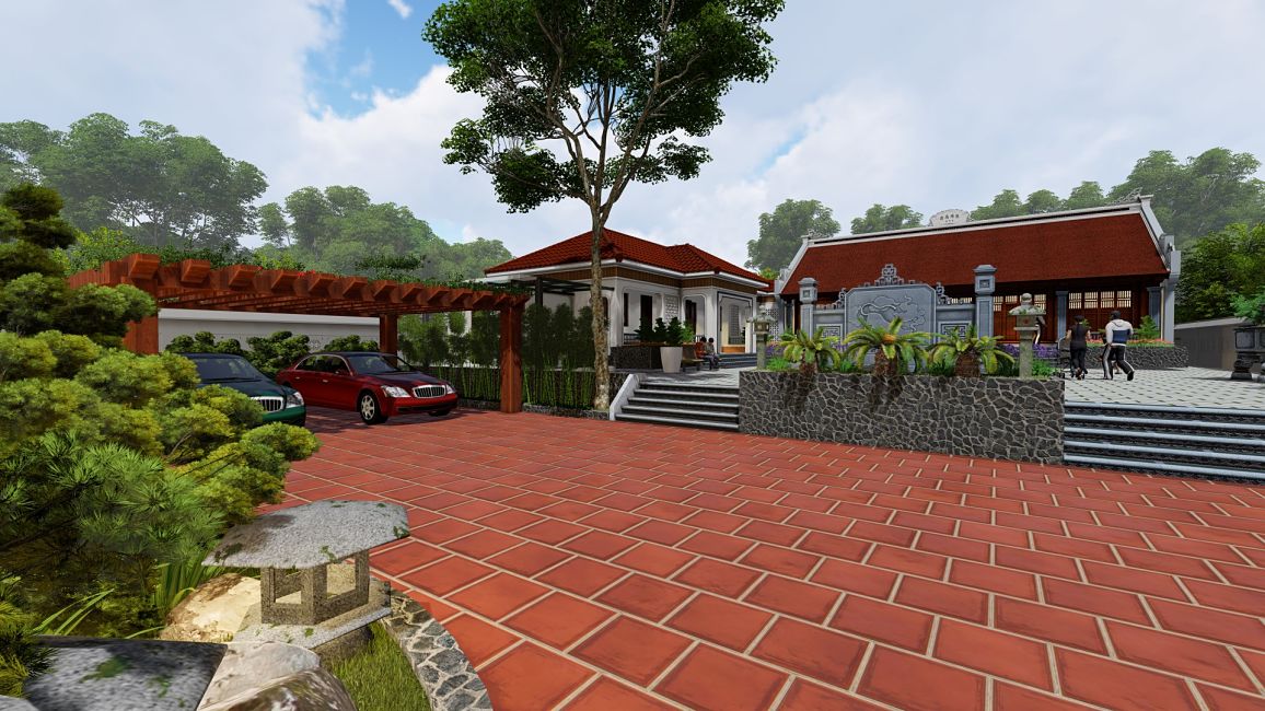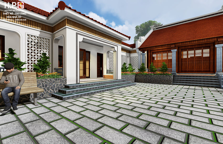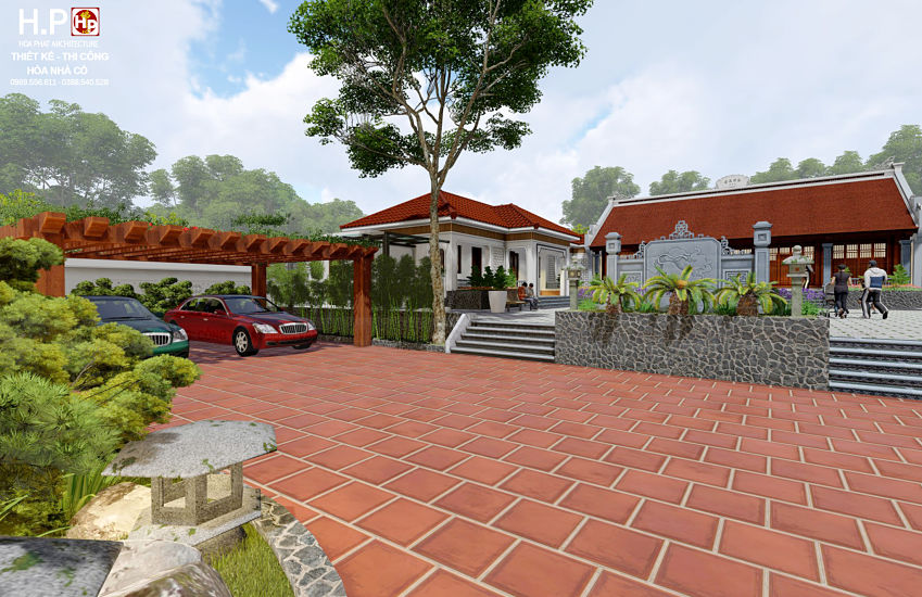 ♦ Công trình nhà được đặt giữa một khuôn viên sân vườn. Bao gồm 1 nhà gỗ 5 gian, một nhà ở 1 tầng mái hiện đại, một nhà phụ để xe…