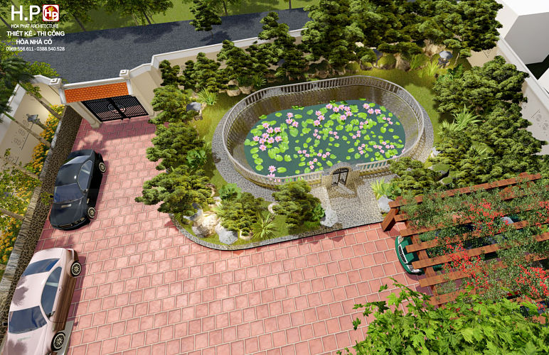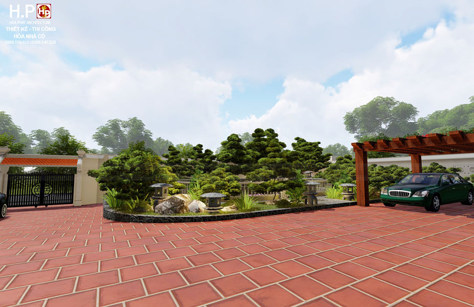 ♦ Bao quanh căn nhà là nhiều cây cối, thảm cỏ đẹp. Phần cổng nhà được làm theo lối 2 mái truyền thống tạo sự hài hòa giữa hai nền kiến trúc khác nhau.