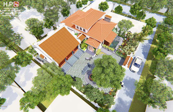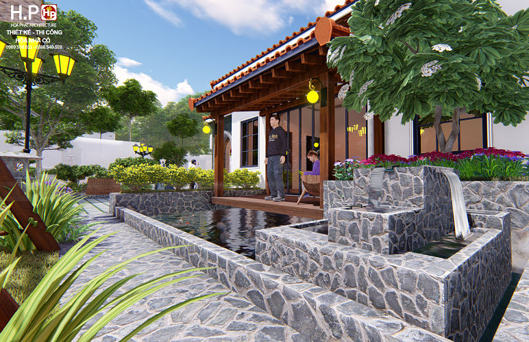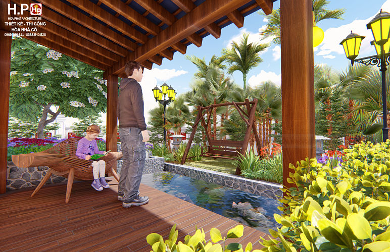 Khuôn viên sân vườn: Trước nhà ở được thiết kế thêm hồ nước, xíc đu là nơi thư giãn vui chơi bên con cháu và giếng nước trước nhà 3 gian tạo sự phong thủy. Cây cảnh hoa lá được thiết kế trong ngoài toàn diện tích khuôn viên