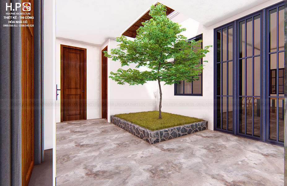 Trước nhà được thiết kế khoảng sân rộng lát gạch giả đá kiểu công mạch. Cổng nhà 2 mái và tường bao xung quanh